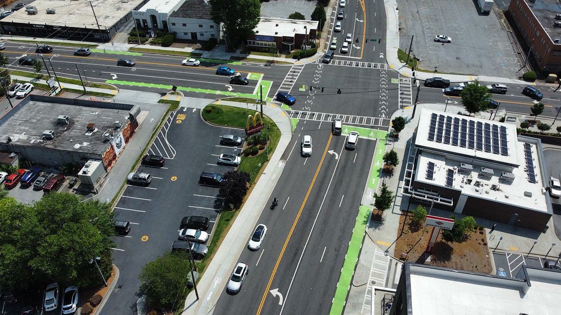 To improve safety in downtown Decatur, Big Apple Services was brought in to reconfigure a heavily traveled four-lane roadway into a safer, more efficient two-lane road with dedicated bike lanes on both sides. By collaborating closely with civil engineers and general contractors, our team successfully delivered a project that had already faced several years of delays before we stepped in.